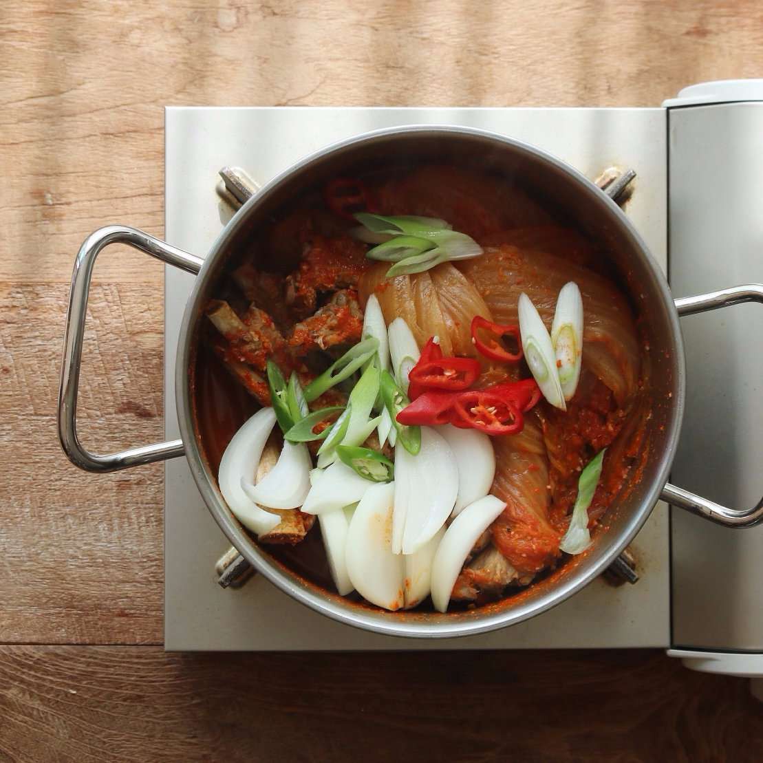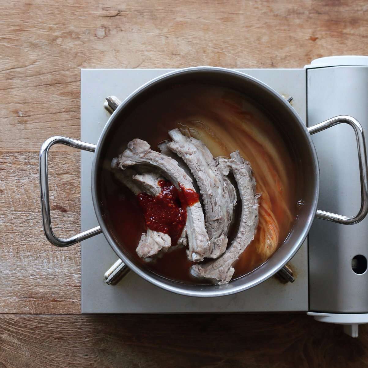 Cho kim chi, sườn, 750ml nước dùng và các gia vị vào một nồi sạch. Đun với lửa vừa trong 20 phút.