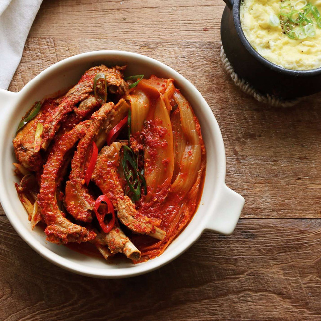 Từng miếng sườn kho kim chi cay ngon đậm vị đảm bảo chỉ ăn một lần là mê.