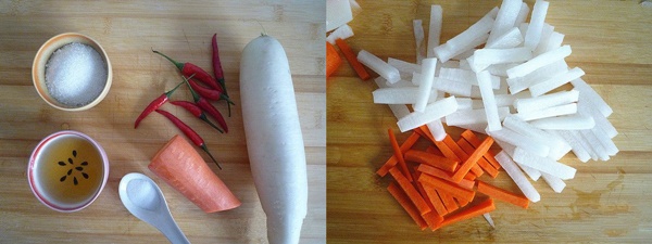 Cho củ cải, cà rốt vào bát rồi thêm muối, trộn đều. Ướp khoảng 20 phút. Trong lúc ướp củ cải thì cho đường vào thố, thêm nước ấm hòa tan.