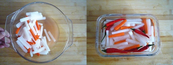 Củ cải cà rốt sau khi ướp 20 phút thì lấy ra vắt nhẹ rồi rửa sạch lại với nước. Cho củ cải, cà rốt, ớt vào thố giấm đường trộn đều rồi đậy nắp lại. Để củ cải cà rốt trộn chua ngọt trong ngăn mát tủ lạnh khoảng 1 ngày là dùng được.