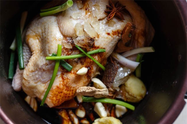 Gà làm sạch cho vào nồi, sau đó thêm tất cả phần gia vị vào xoa đều lên lên thân gà. Ướp ít nhất 3 tiếng, thỉnh thoảng lật gà lại để đảm bảo thân gà được thấm gia vị đều nhau.