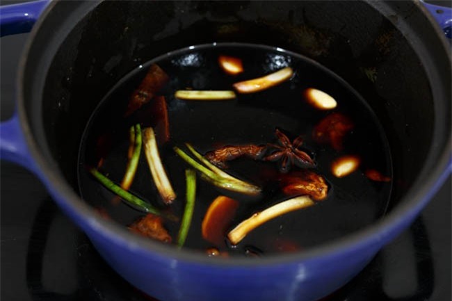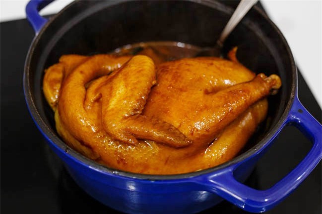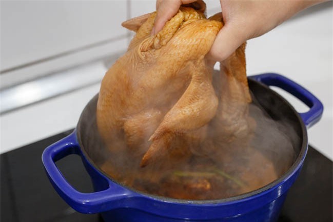Đun sôi nước thì thả gà vào. Lúc này giảm lửa xuống chỉ để ở mức trung bình. Sau khoảng 15 phút thì lật gà lại.