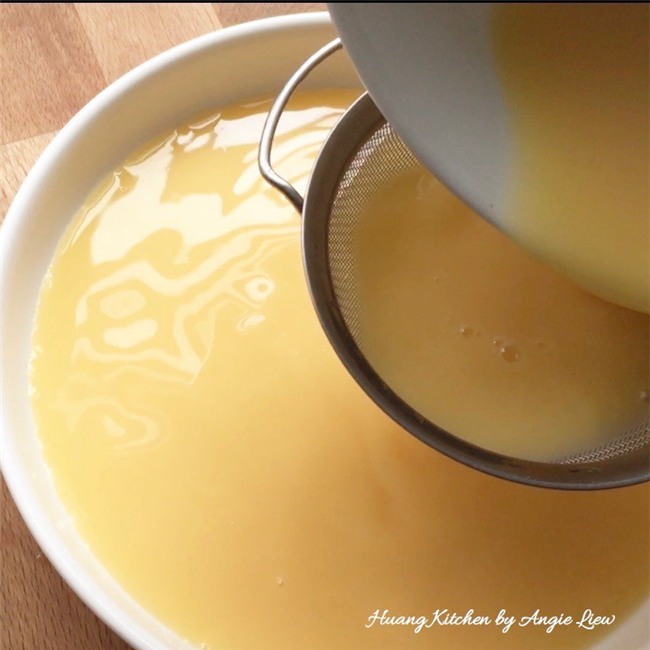 Rây trứng qua rây vào một tô sứ chịu nhiệt. Bước rây trứng này là bước bắt buộc để giúp phần trứng khi hấp được mịn mượt.