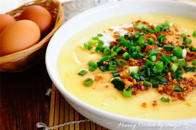 Trứng hấp chín lấy ra, rưới nước tương, hành thái nhỏ lên trên bề mặt sau đó tiếp tục rưới phần dầu tỏi nóng vào.