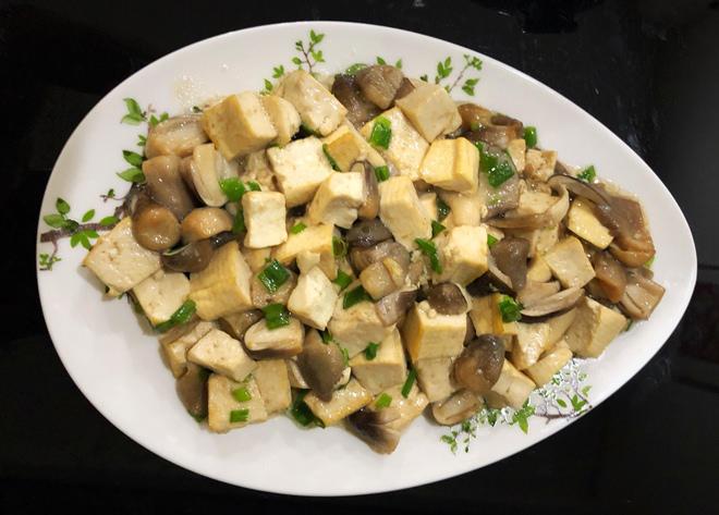 Nguyên liệu: 2 bìa đậu hũ trắng, 150g nấm rơm, hành lá, bột nêm chay, dầu hào chay, hành củ, muối, dầu ăn, tiêu.