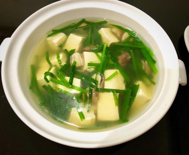 - Bắc nồi nước trên bếp, nước sôi thêm thìa bột nêm khuấy tan. Sau đó cho đậu hũ, nấm rơm vào đun sôi trở lại, thêm lá hẹ, nêm nếm vừa ăn. Cho canh ra tô là được.