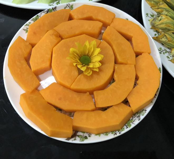 - Nhồi phần nhân đẫu hũ nấm rơm vào giữa bông bí, xếp lần lượt vào đĩa. Dùng màng thực phẩm bao kín lại, cho vào xửng hấp hoặc lò vi sóng hấp khoảng 5-8 phút là được.