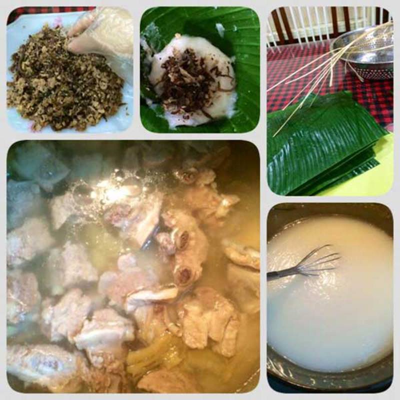 - Xếp 2 lớp lá để tạo thành hình chữ nhật, cỡ 20 x 25 cm. Đặt khuôn trong lên xếp theo các cạnh, cho vào khuôn ngoài. Rút khuôn trong ra, cho bột bánh + nhân vào. Gấp đáy. Gỡ khỏi khuôn, cột dây.