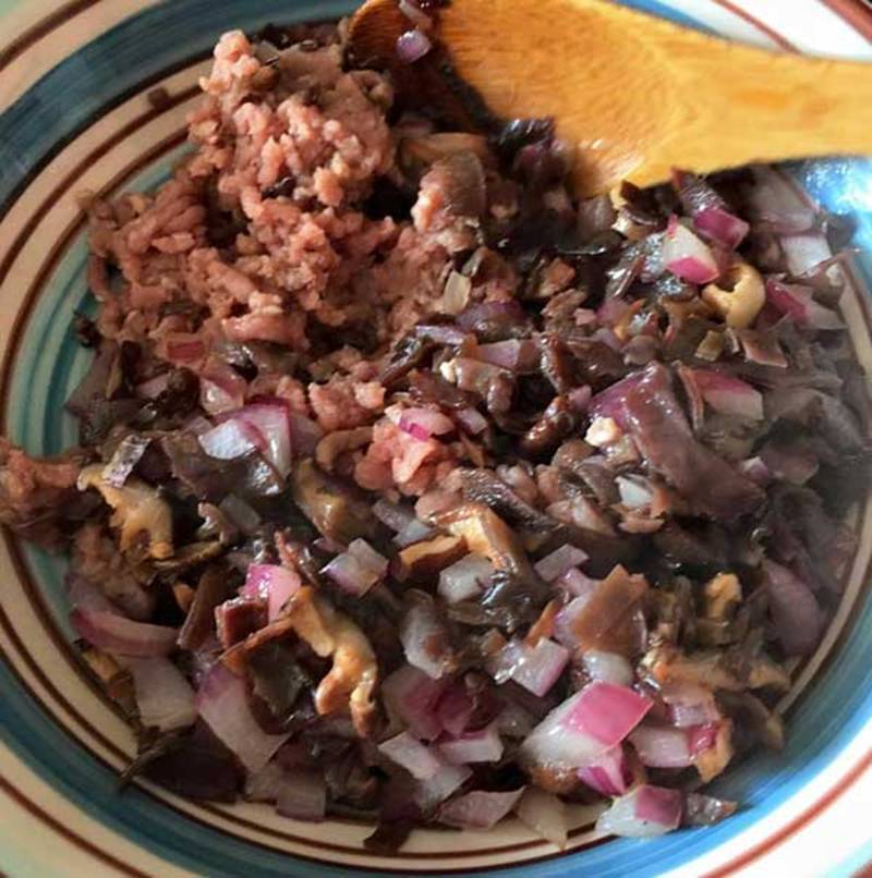 - Nấm mèo ngâm nước lạnh, băm nhỏ nhưng ở nhà tớ luộc nấm mèo cho bớt mùi hăng.