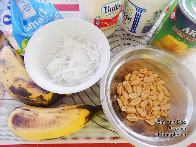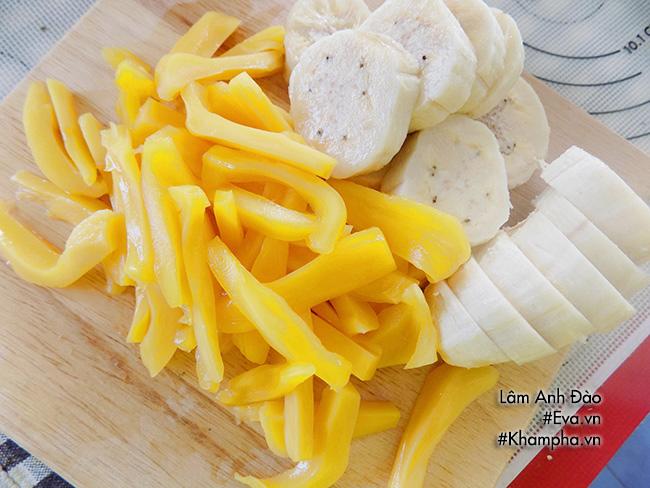 Bước 1: Chuối lột vỏ, bỏ chỉ, thái lát không quá mỏng. Mít thái sợi.