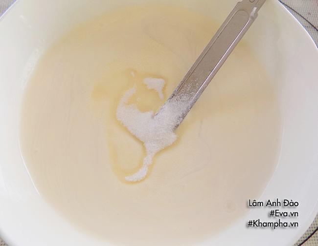 Bước 2: Kem whipping + vanilla + đường cho vào âu, dùng máy đánh sánh (bạn có thể đánh bằng tay). Sau đó cho sữa chua + sữa đặc + muối vào trộn đều.
