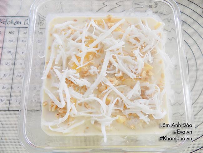 Bước 3: Cho 1 lớp kem vào khuôn. Sau đó xếp chuối và mít. Tiếp tục đổ một lớp kem khác lên rồi lại xếp chuối, mít... Cứ như thế làm cho hết kem, chuối và mít.