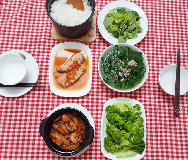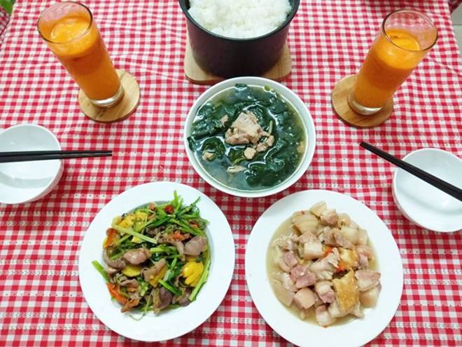 Khi nấu ăn, chị luôn cố gắng cân bằng dinh dưỡng giữa các món và luôn ưu tiên rau xanh cùng thực phẩm tươi ngon. Để tốt cho sức khỏe, bà mẹ 2 con cũng hạn chế nấu các món ăn có nhiều dầu mỡ cũng như đường. Hôm nào ăn đơn giản thì chị sẽ bổ sung thêm sữa tươi, sữa đậu nành. Hôm nào chế độ ăn chứa dinh dưỡng cao thì bổ sung nước cam, nước ổi, cóc, cà chua để cân bằng. Mỗi bữa ăn chiều như vậy chị sẽ mất từ 30-60 phút để chuẩn bị, tùy món.