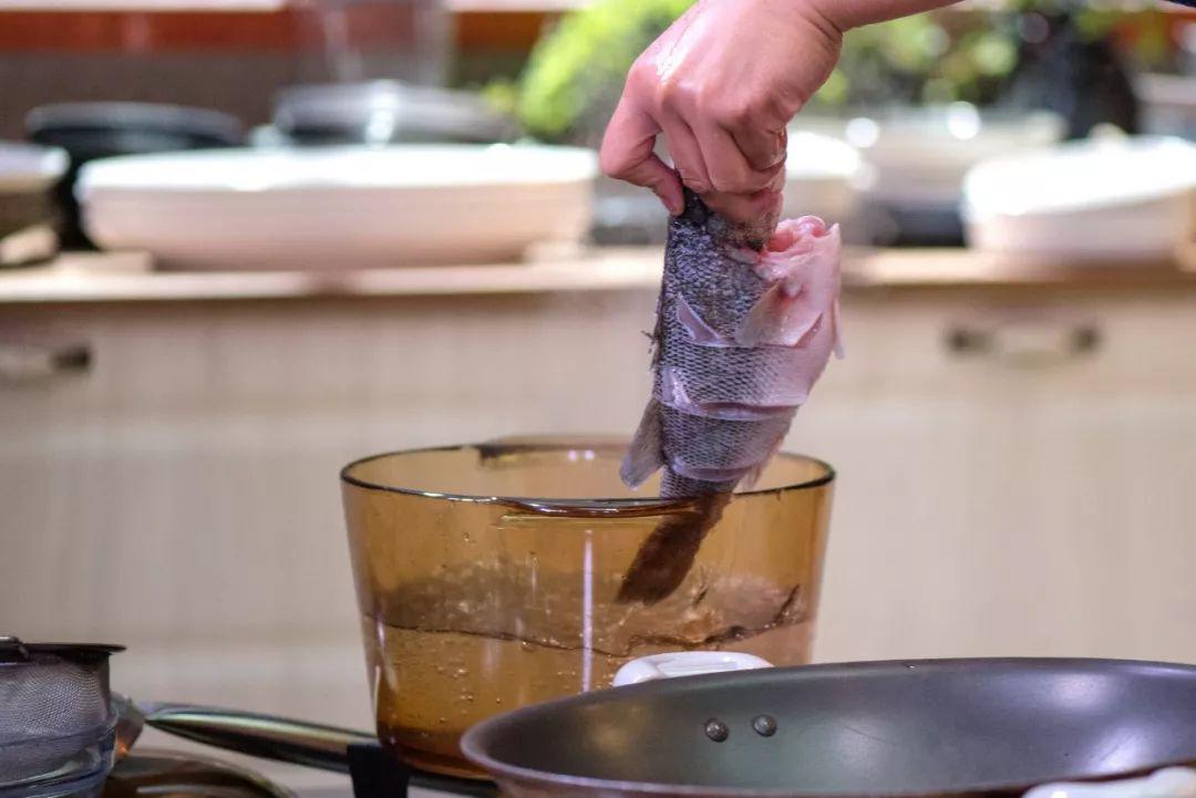 - Cầm đầu cá, nhúng thân cá vào một nồi nước sôi trong 3 giây sau đó cho cá vào ngay bát nước lạnh để tránh cá bị nát. Tương tự, cầm đuôi cá rồi nhúng đầu cá vào nồi nước sôi trong 3 giây, sau đó nhúng đầu cá vào bát nước lạnh. Điều này giúp loại bỏ bớt chất nhớt ở cá.