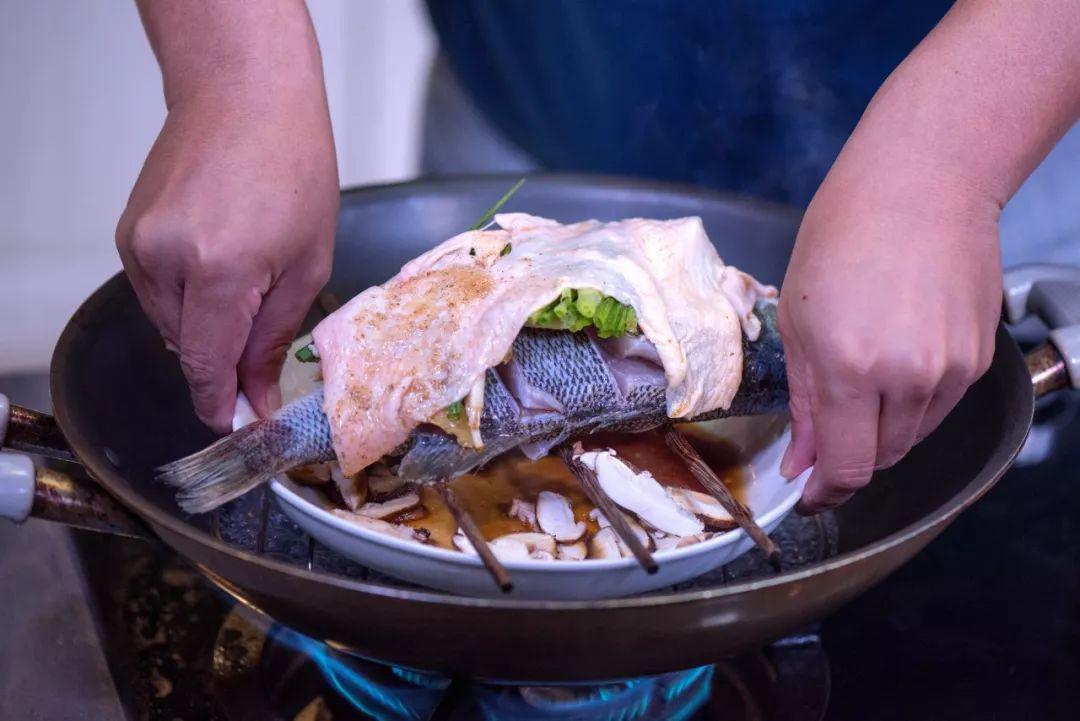 - Đổ phần sốt hấp vào đĩa bên dưới. Sau đó đặt cá vào nồi hấp trong 6-8 phút, hạ nhỏ lửa, hấp thêm 2 phút thì tắt bếp. Thời gian có thể tăng thêm nếu bạn làm con cá to hơn.