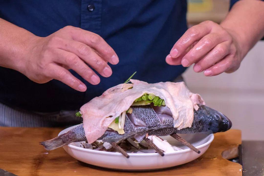 - Đặt nấm vào trong lòng đĩa sâu đã chuẩn bị để hấp cá. Xếp 3 chiếc đũa song song trên mặt đĩa rồi đặt cá nằm lên đũa. Xếp gừng, hành lá lên cá. Cuối cùng phủ tấm da gà lên cá.