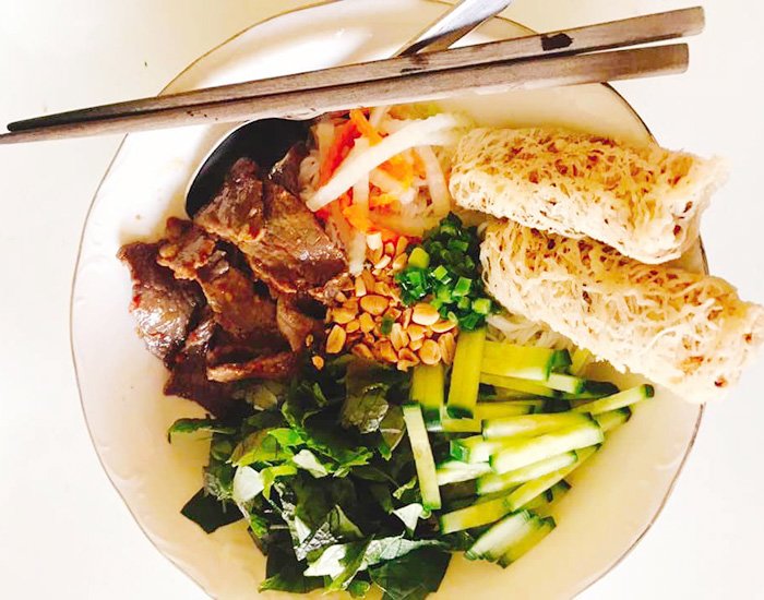 Chả giò rế giòn, vàng rụm có thể ăn kèm với nộm, lạc rang và thịt bò muối.