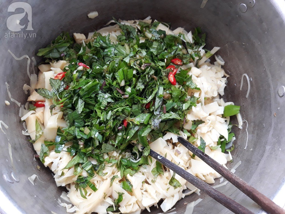 Cho măng vào nồi, thêm rau thơm, ớt, hành, tỏi, vừng rang, rưới phần nước trộn nộm lên trên, đảo đều. Có thể nêm lại gia vị xem đã vừa chưa rồi rắc lạc lên và gắp ra đĩa.