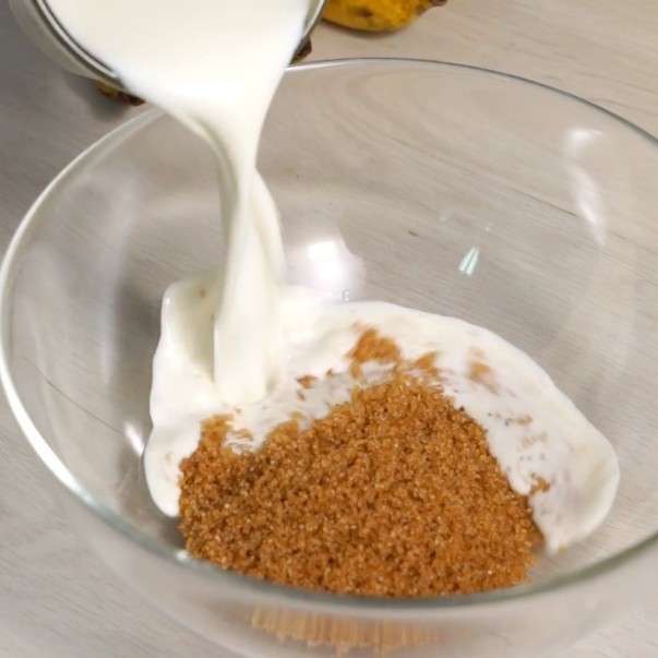Cho đường nâu và sữa vào âu rồi dùng phới lồng khuấy đều tay đến khi đường tan hết.