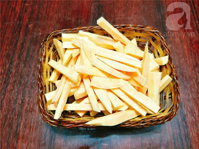 Khoai lang rửa sạch rồi đem nạo sạch vỏ sau đó thái khoai thành từng thanh dài, rửa lại cho khoai hết nhựa và để thật ráo nước.