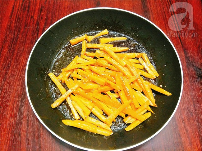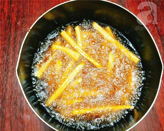 Đặt chảo dầu lên bếp đun cho dầu đủ nóng mới thả khoai vào chiên tới khi khoai chín vàng giòn thì vớt ra để cho ráo dầu.
