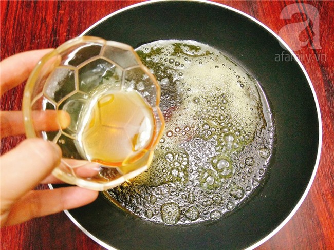 Đặt chảo sạch lên bếp rồi cho bơ vào, đun cho bơ tan chảy hết thì cho mật ong và lắc nhẹ chảo cho hỗn hợp hòa đều.