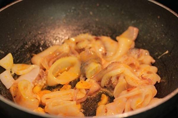 - Đun nóng một ít dầu ăn, phi hành thơm, cho mực vào xào chín, đổ ra bát để riêng.