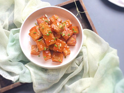Đậu phụ thái miếng vừa ăn xếp đều dưới lòng đĩa sau đó cho phần thịt xào lên trên rồi rắc vừng rang lên là xong.
