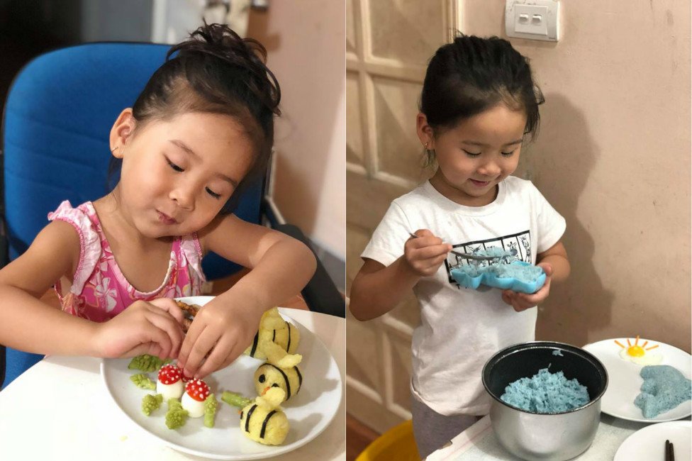 Con gái chị hào hứng phụ giúp mẹ nặn cơm và trang trí phần cơm của mình.