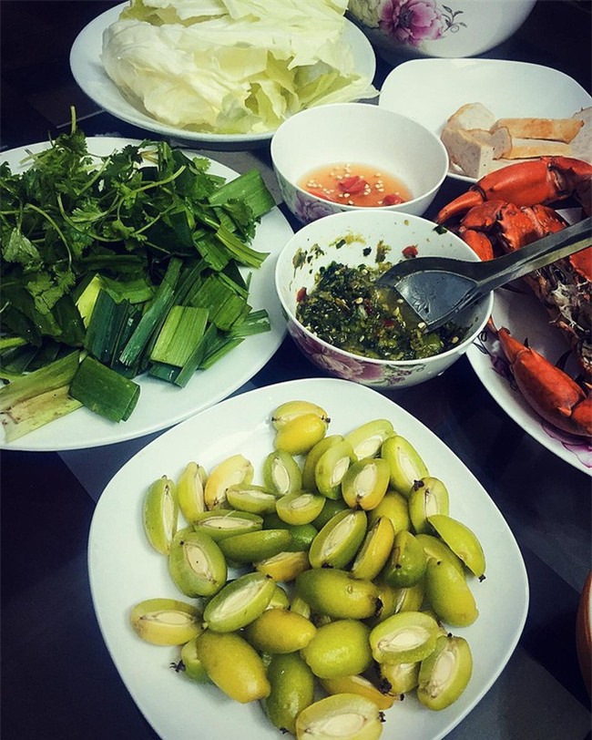 nhót xanh với bắp cải, lá tỏi ta kèm bát chẩm chéo hoặc nước mắm pha.
