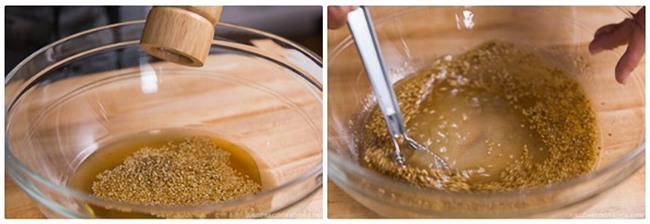 Cho giấm táo, đường cát, dầu mè, mè trắng, muối và tiêu xay vào tô trộn đều.