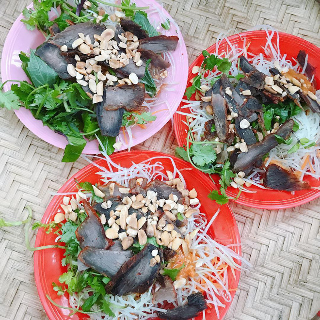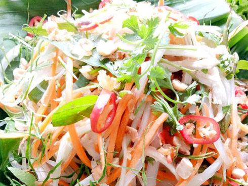 Đĩa nộm đu đủ xanh có thêm vài miếng chim cút quay, kể ra ăn khá thú vị và vui miệng. Chưa kể, thường phần nộm này vẫn có thêm bò khô để thoả mãn nên nếu là team mê thịt, chắc chắn sẽ rất mê món này.
