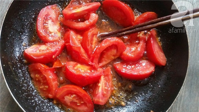Cà chua bổ múi cau. Phi thơm hành cùng dầu ăn, cho cà chua vào đảo đều, thêm chút bột canh để cà chua nhanh mềm. Khi cà chua mềm thì cho phần gạch cua khều lúc đầu vào đảo đều cùng cà chua. Cách làm này giúp món riêu cua vừa thơm vị đặc trưng vừa có màu rất đẹp.