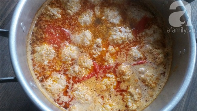 Tiếp tục đổ phần chưng cà chua vào nồi, để sôi rồi nặn các viên thịt bằm thả vào nồi riêu. Đun nhỏ lửa để thịt chín kỹ. Khi thấy thịt nổi lên mặt nước thì cứ để sôi thêm vài phút sau đó mới nêm nếm gia vị. Có thể để nồi riêu trên bếp với lửa nhỏ nhất, để tránh cho riêu đỡ bị nguội.
