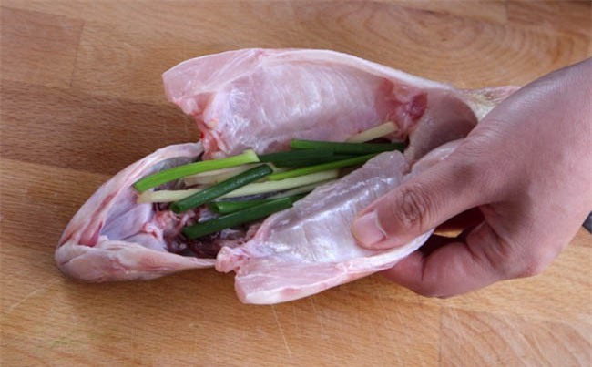 Nếu cá dày mình bạn có thể khía vài đường trên thân cá. Sau đó xoa khắp thân cá chút muối. Rồi xếp hành vào trong bụng cá.