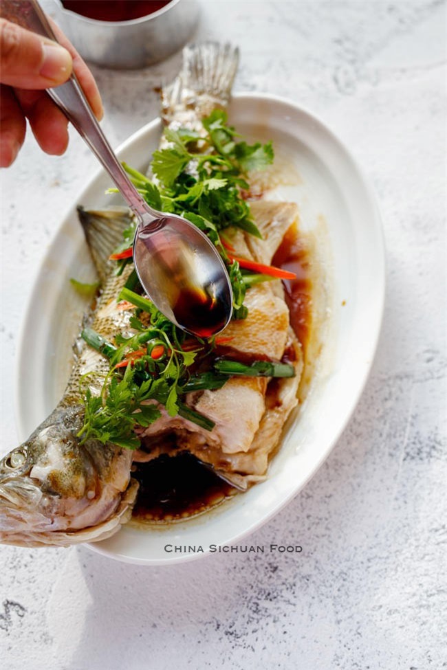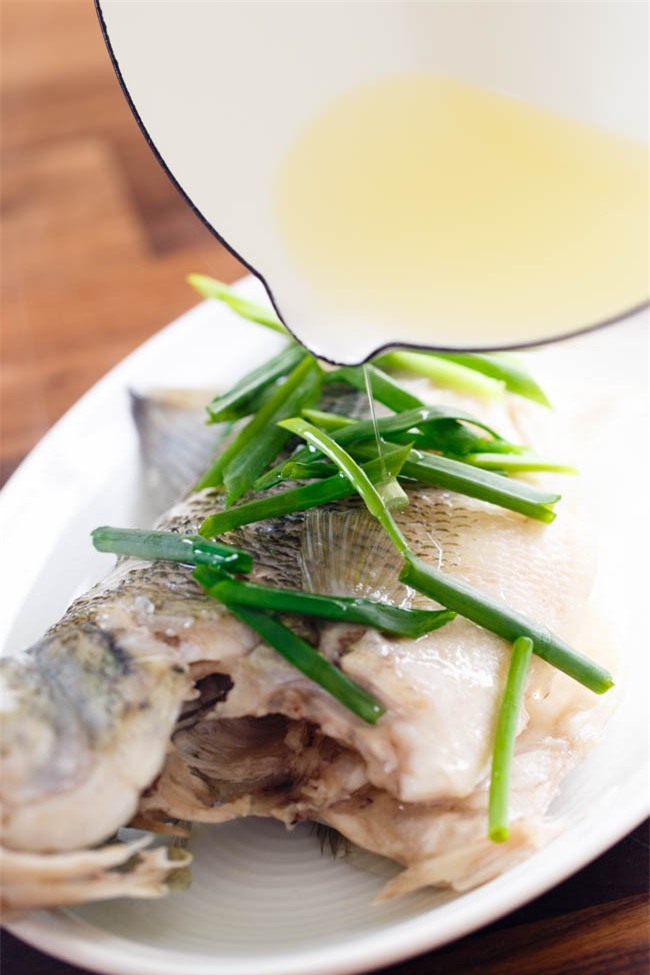 Hấp cá khoảng 10 phút là cá chín. Gắp bỏ phần hành và gừng đã hấp đi, xếp 1 lượt hành lá mới lên trên. Đun nóng 2 thìa dầu ăn sau đó từ từ rưới lên trên phần hành.