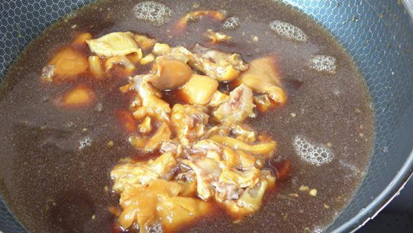 Móng giò sau khi hầm chín mềm thì gỡ bỏ xương ra. Đổ cả nước hầm và phần thịt móng giò vào nồi đun thêm 10 phút nữa rồi tắt bếp.