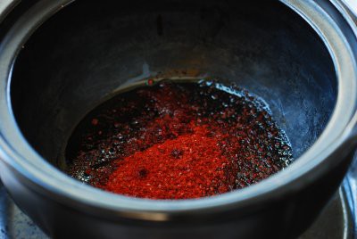 Thêm ớt đỏ và dầu mè vào một cái nồi nhỏ và đặt lên lửa vừa. Khuấy cho đến khi hỗn hợp đồng nhất.