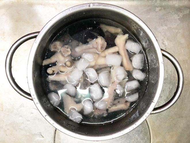 Khi chân gà chín, vớt ngay ra cho vào ngâm trong bát nước đá 10 phút để chân gà săn và giòn.