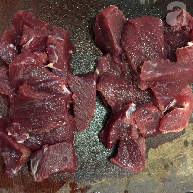Thịt bò mua về rửa sạch, lọc hết phần gân lẫn trong thịt. Thái miếng nhỏ, chia ra làm 3 phần, bỏ vào túi ni lông đặt vào ngăn đá tủ lạnh khoảng 3 tiếng hoặc tới khi thịt bắt đầu đóng đá.
