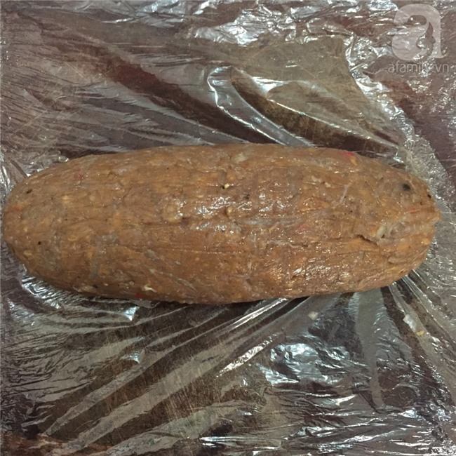 Trải màng bọc thực phẩm ra, cho phần nem chua đã nhào vào, nặn thành hình trụ.