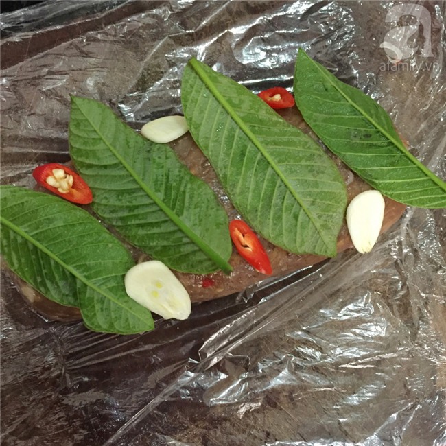Lần lượt xếp lá ổi, ớt và tỏi lên mặt của nem chua.