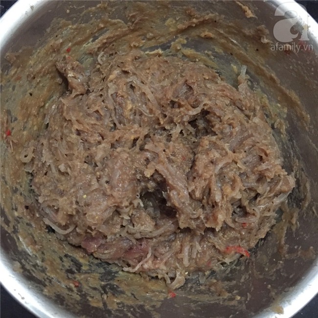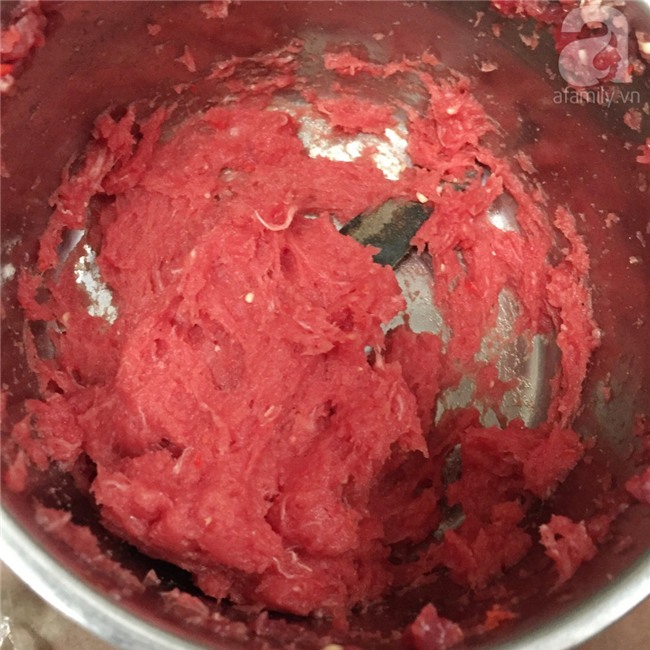 Thịt bò sau khi đóng đá, đem đi xay nhuyễn như xay giò sống. Xay từng phần để tránh cho thịt bị chín.