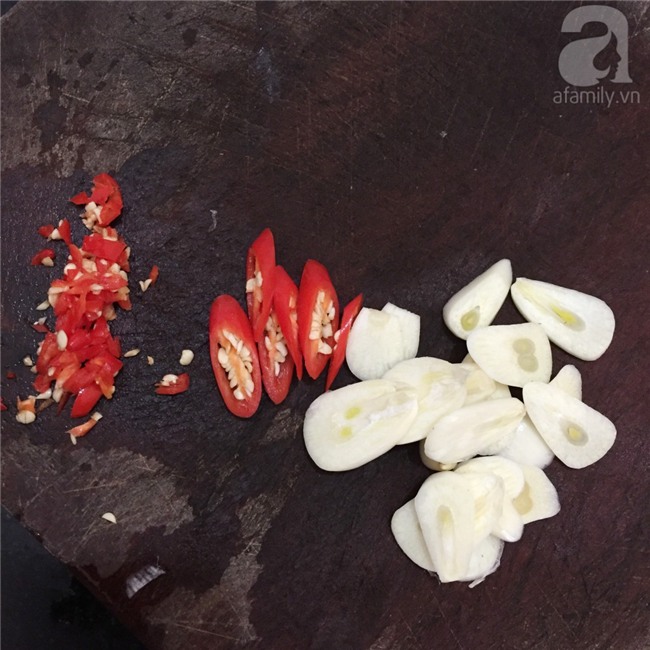 Tỏi thái lát mỏng. Ớt chia làm 3 phần, 2 phần băm nhỏ, 1 phần thái lát mỏng. (Tùy khẩu vị của gia đình mà bạn gia giảm lượng ớt cho phù hợp). Lá ổi rửa sạch để ráo nước.