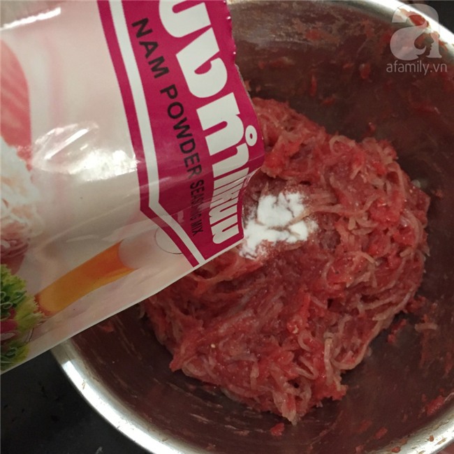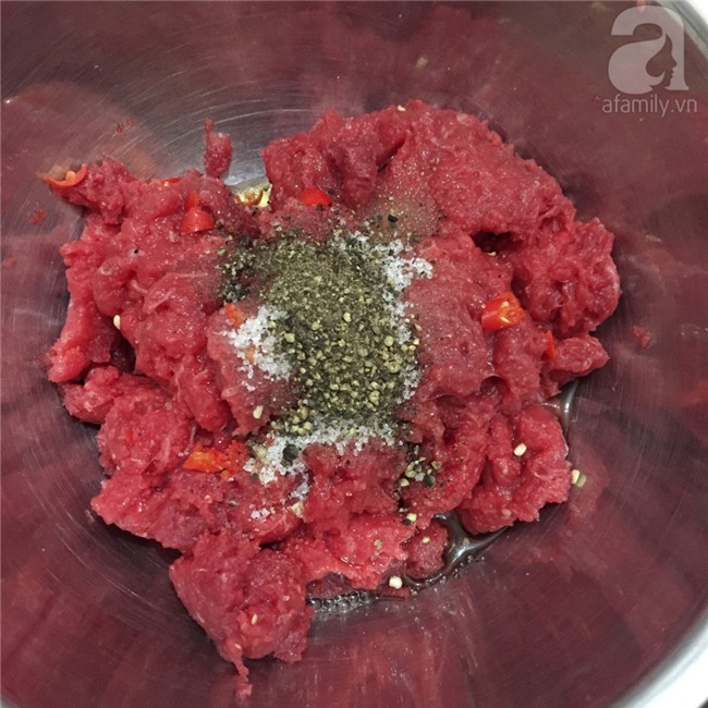 Cho thịt bò vào tô, thêm 3 thìa súp nước mắm. 1 thìa cafe hạt tiêu, 3 thìa cafe đường, ớt băm rồi trộn đều lên.