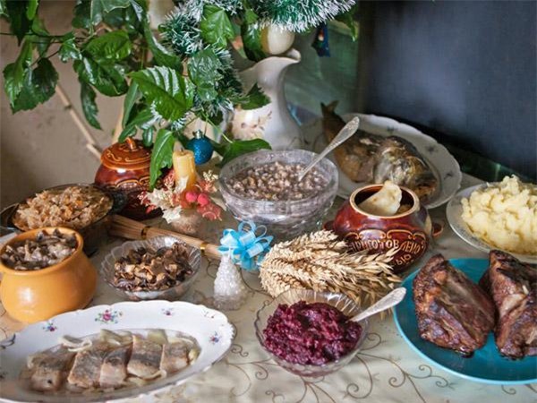 Món chính trong ngày Giáng sinh là kutia, được nấu bằng lúa mì kết hợp với mật ong, nho khô và các loại hạt ớt để tượng trưng cho sự thống nhất. Họ cũng ăn bánh bao nhân đậu, cải bắp và dưa bắp. Bữa ăn gồm mười hai món ăn.
