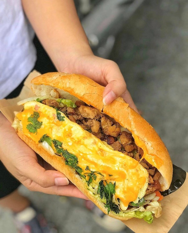 Bánh mì heo cay phủ phô mai - 8 Nguyễn Thị Nghĩa, quận 1: Tiệm nổi tiếng với món bánh mì heo cay phủ phô mai. Một ổ bánh mì King size tại đây gây ấn tượng với các tín đồ ẩm thực bởi vẻ bề ngoài hoành tráng, đầy ắp topping hấp dẫn. Bên trong bánh mì bao gồm rau hành, trứng omelette, sốt mayonnaise, chua ngọt, thịt heo cay và phô mai miếng. Ảnh: Lanwiththi, Hukhafoodaholic.