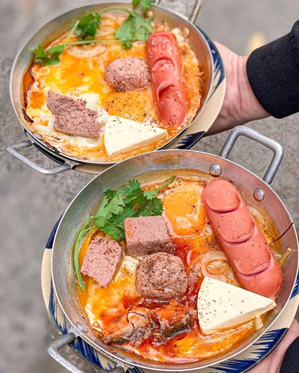 Bánh mì chảo thập cẩm - 172 Hoà Hưng, quận 10: Phần bánh mì chảo thập cẩm tại đây hút khách với topping đa dạng. Chảo gồm trứng ốp la, xíu mại, pate, phô mai, xúc xích, cá hộp... kèm ổ bánh mì giòn tan và đĩa rau xà lách. Ảnh: Momentoffood.