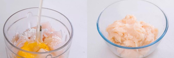 Cá rửa sạch, thấm khô nước rồi thái miếng nhỏ cho vào máy xay, thêm tinh bột ngô và trứng vào rồi xay nhuyễn. Cá sau khi xay cho ra bát tô.