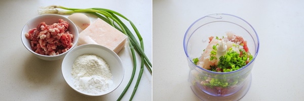 Hành lá thái nhỏ, cho thịt băm và tôm vào máy xay, thêm hành lá và chút muối.
